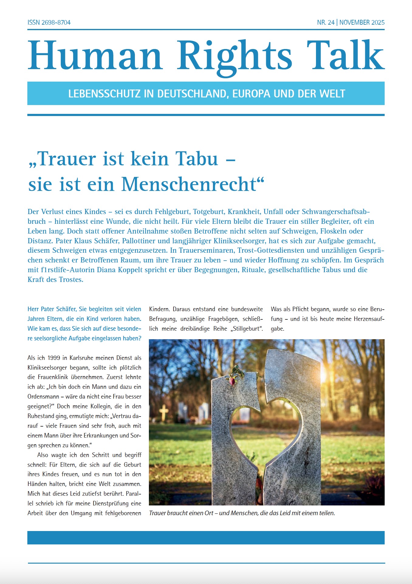 Nach fünf Jahren war es endlich wieder so weit: Am 10. Mai 2025 hat die STIFTUNG JA ZUM LEBEN erneut ihren Stiftungspreis für Lebensbotschafter verliehen. Mit diesem ehrt die Stiftung Personen und Initiativen, die sich auf beispielhafte Weise für die Hilfe für Frauen im Schwangerschaftskonflikt, den Schutz von ungeborenen Kindern oder die Unterstützung von Familien in Not einsetzen. Lesen Sie im Human Rights Talk mehr über das langjährige Engagement der beiden diesjährigen Preisträger.